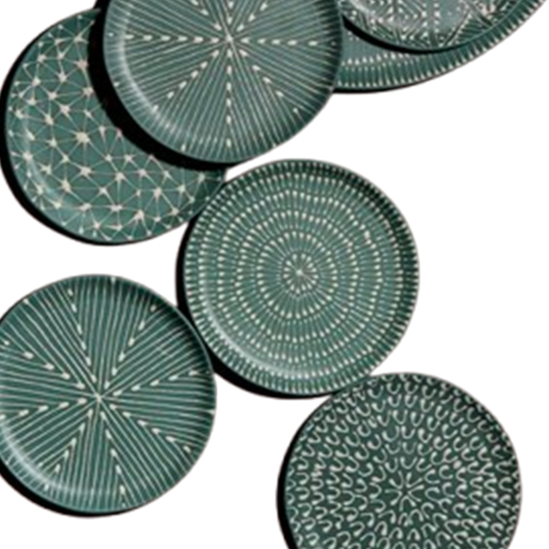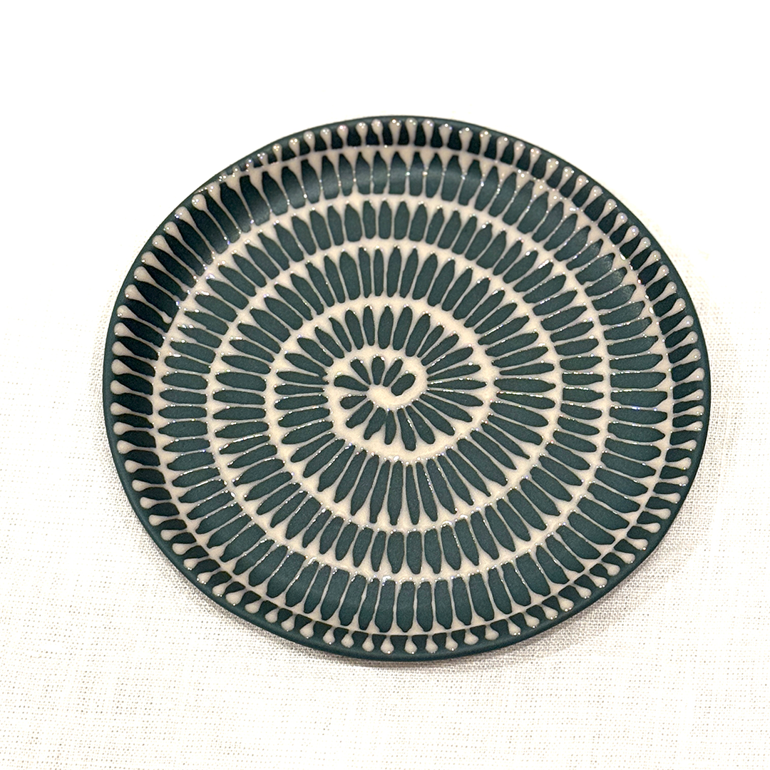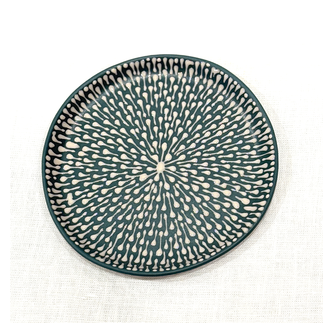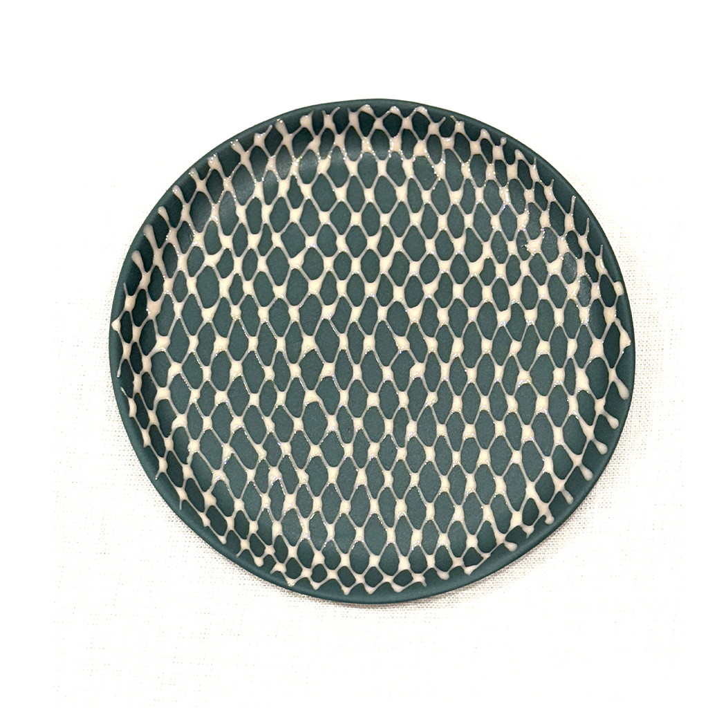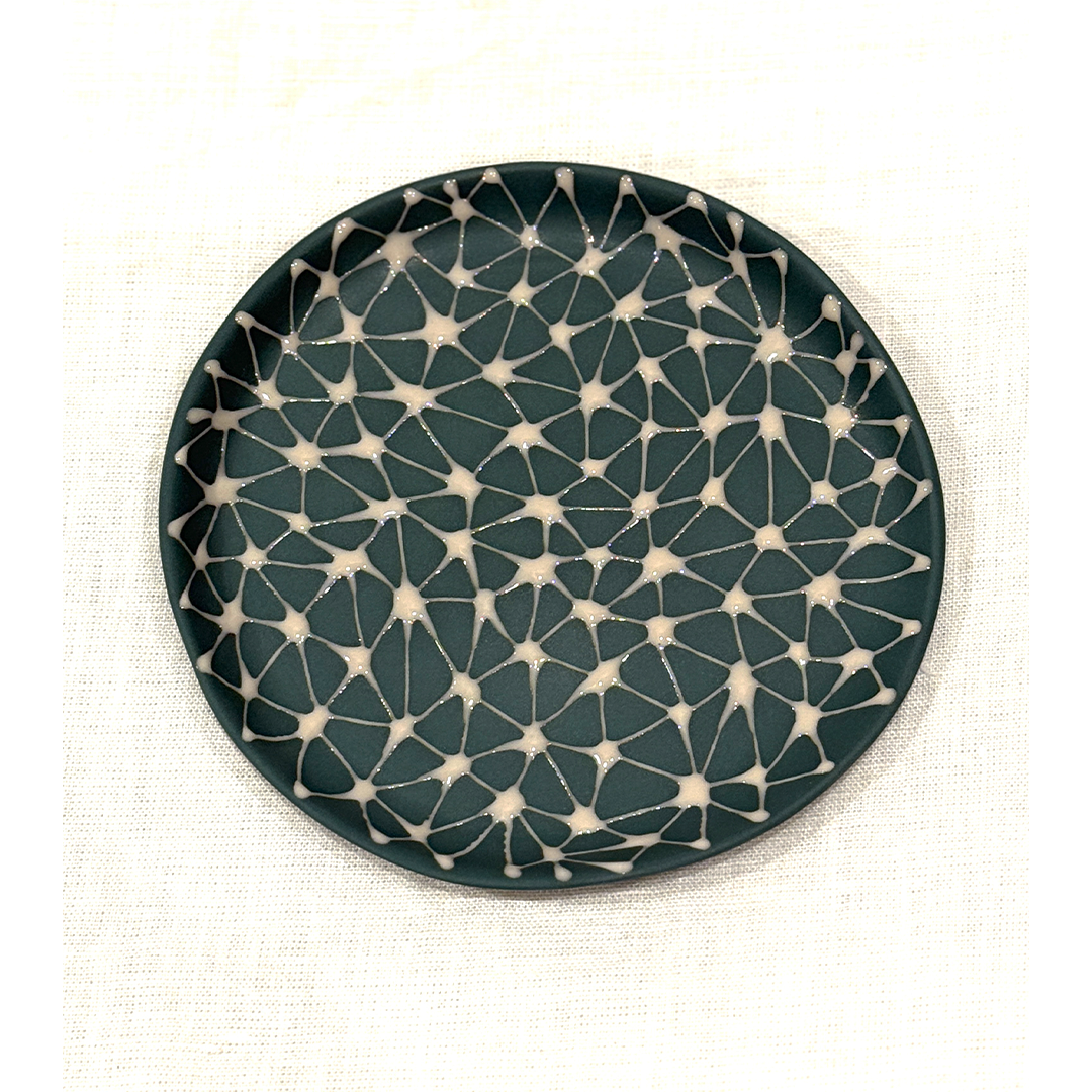 These appetizer or dessert plates are made from colored porcelain and hand decorated with a special glaze to create a delicate multi-layered texture on the tray.