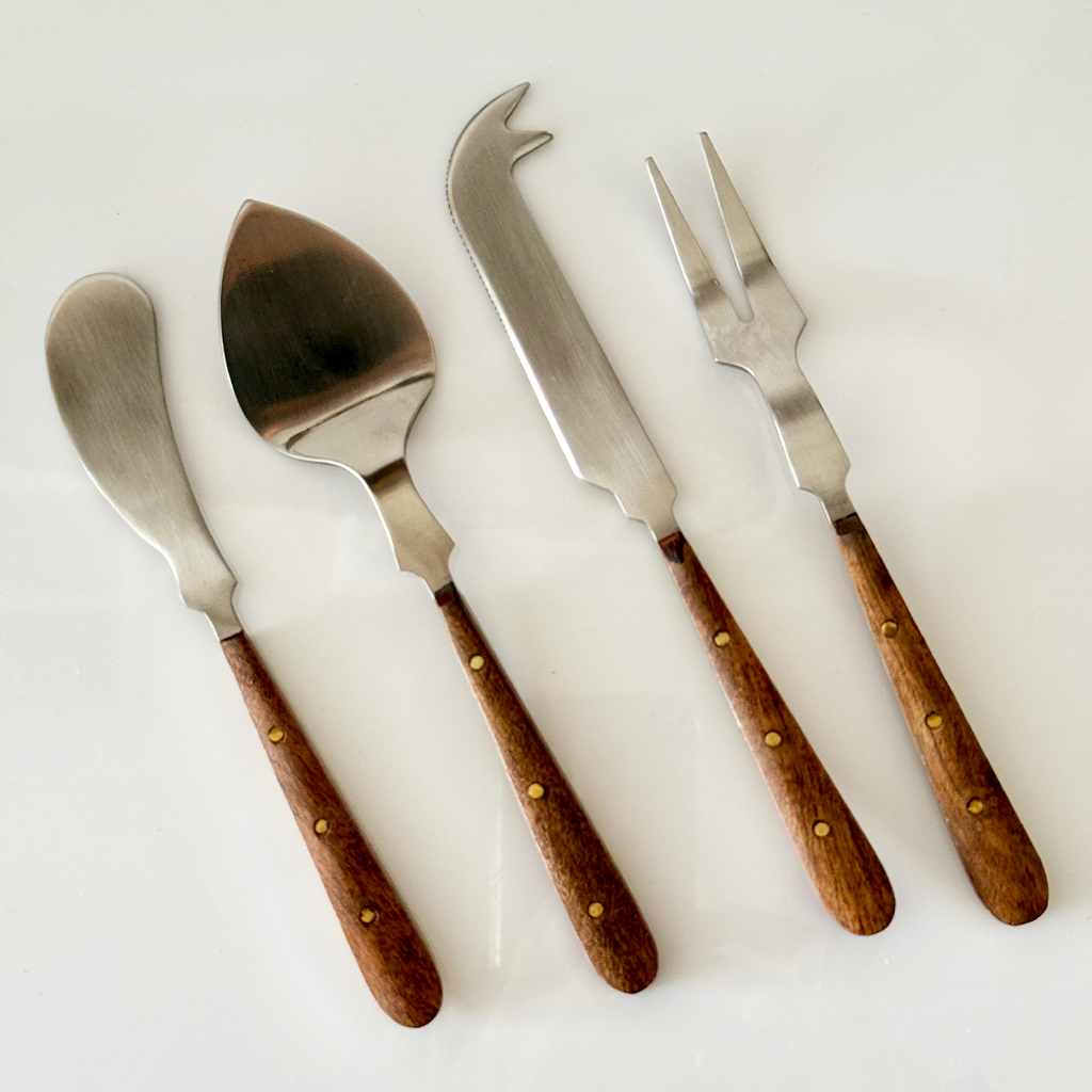 The Quatre ( 4)  Cheese Set with wooden handles is a perfect addition to any cheese lover's collection. This chic set features four cheese tools, each with a silver finish.  Whether for soft, hard, or crumbly cheeses, this versatile set enhances any charcuterie board.