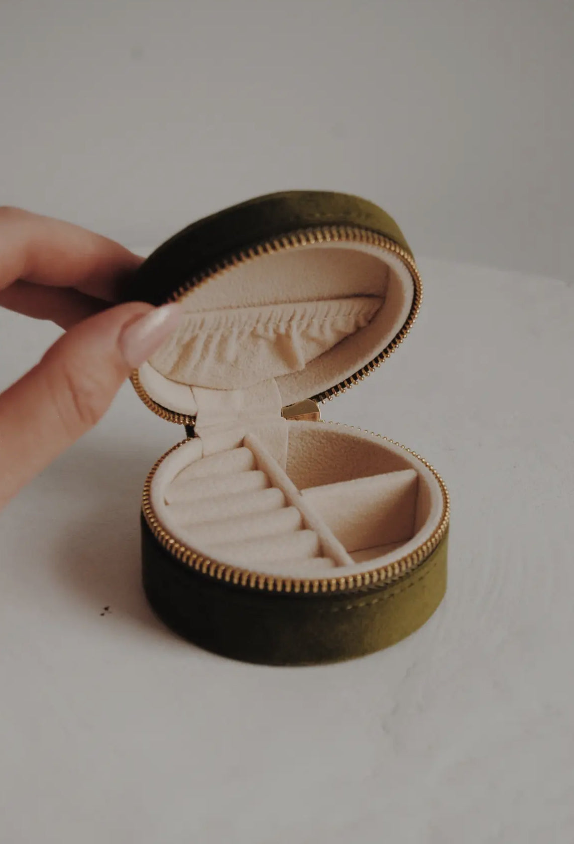 This petite chic circular travel jewelry case is perfect for an overnight or weekend getaway. It can hold rings, earrings, necklaces, and other precious pieces. Features ring tray, dividers, and a pouch.