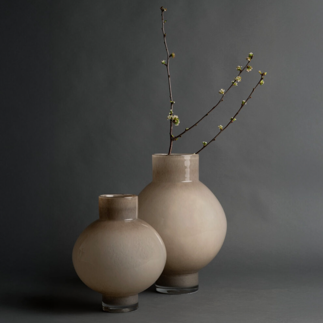 The elegant Felina Vase is a delightfully rounded vessel that sits on a narrow foot and opens into a narrow mouth, beautifully proportioned with contemporary decorative applications in mind. This glossy glass vase shines in the light and reveals complex tonality when admired up close. Beige coloration makes it universally flattering.