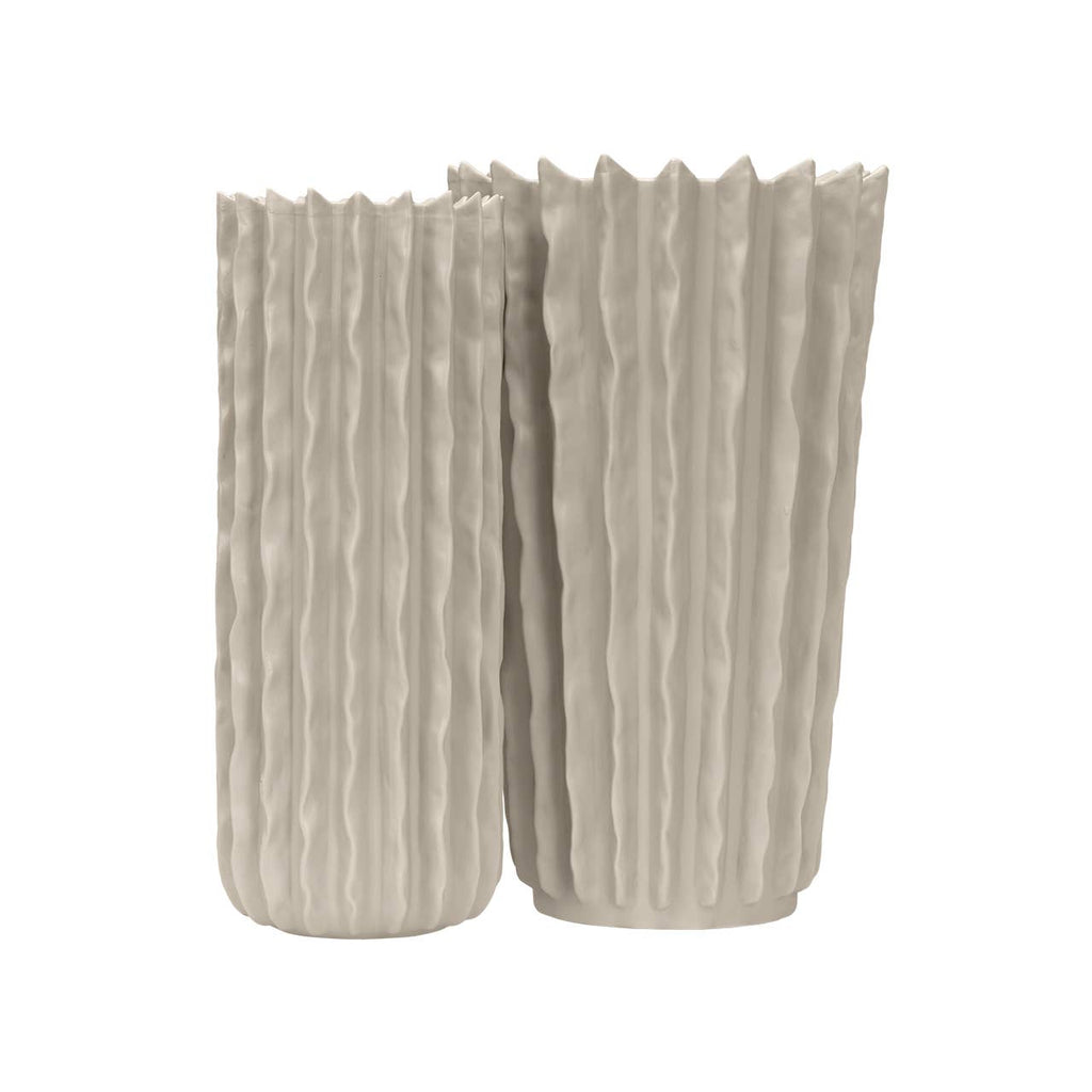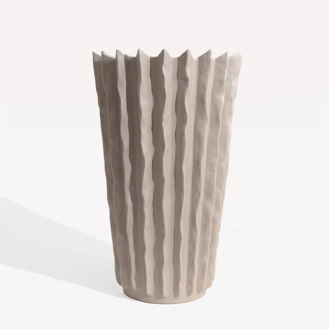 Striking yet simple. A statement piece, crafted from ceramic in a beige matte finish, the Guillian Vase features symmetrical deep vertical ridges that create a textured look on its organic-shaped body. With a wide mouth opening and modern, sophisticated style, this vase is the perfect centerpiece for any room.
