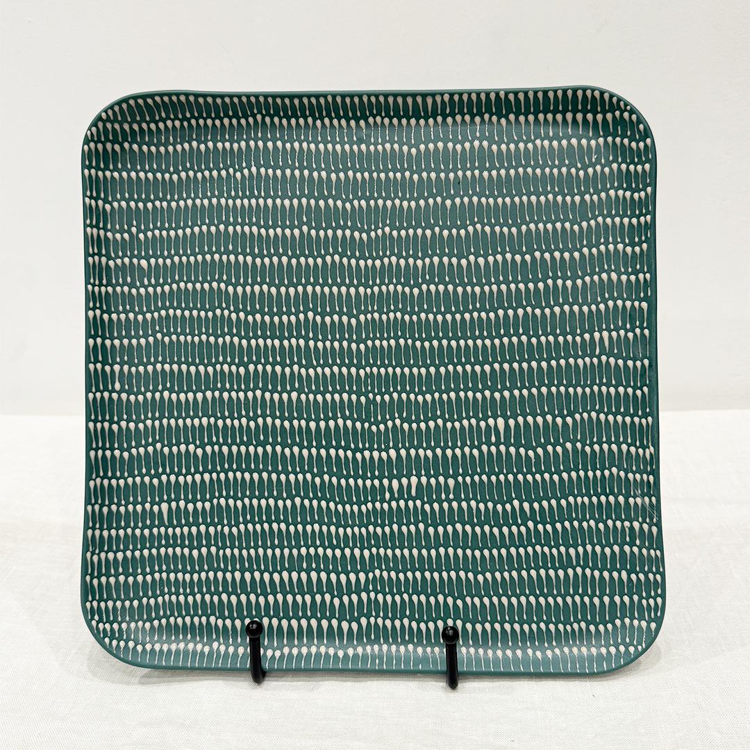 These square-shaped trays are made from colored porcelain and hand decorated with a special glaze to create a delicate multi-layered texture on the tray.