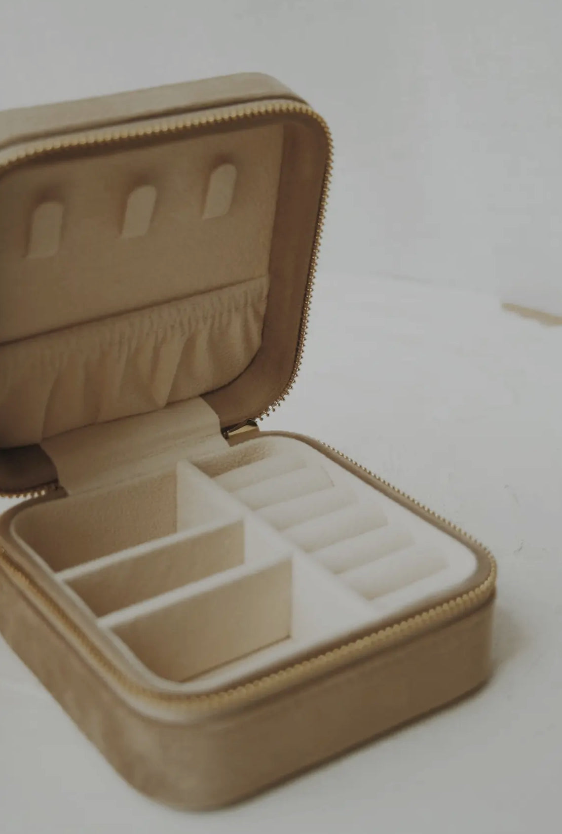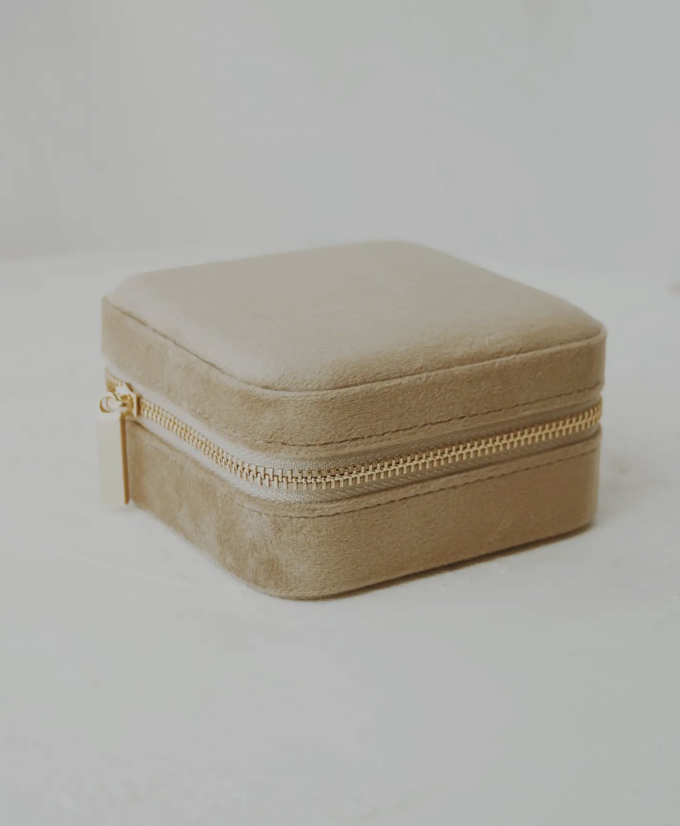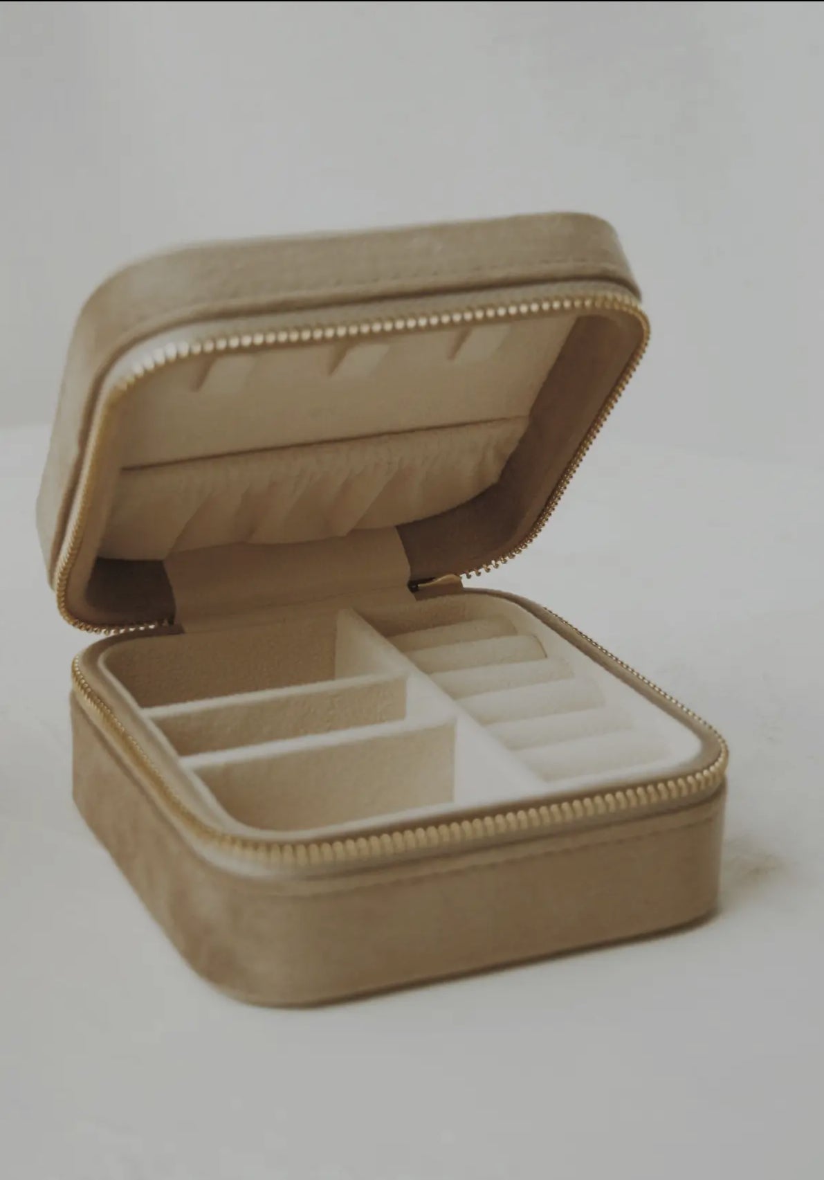 The one and only jewelry travel case you really need. The square box with velveteen interior lining and velvet exterior includes hooks, pouch, moveable dividers, and a ring section.