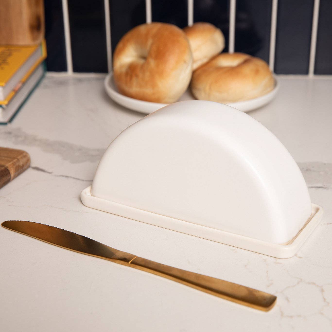 A sleek and functional butter dish with lid for countertop use—keeps butter soft and ready while adding style to your kitchen. Fits one butter stick.