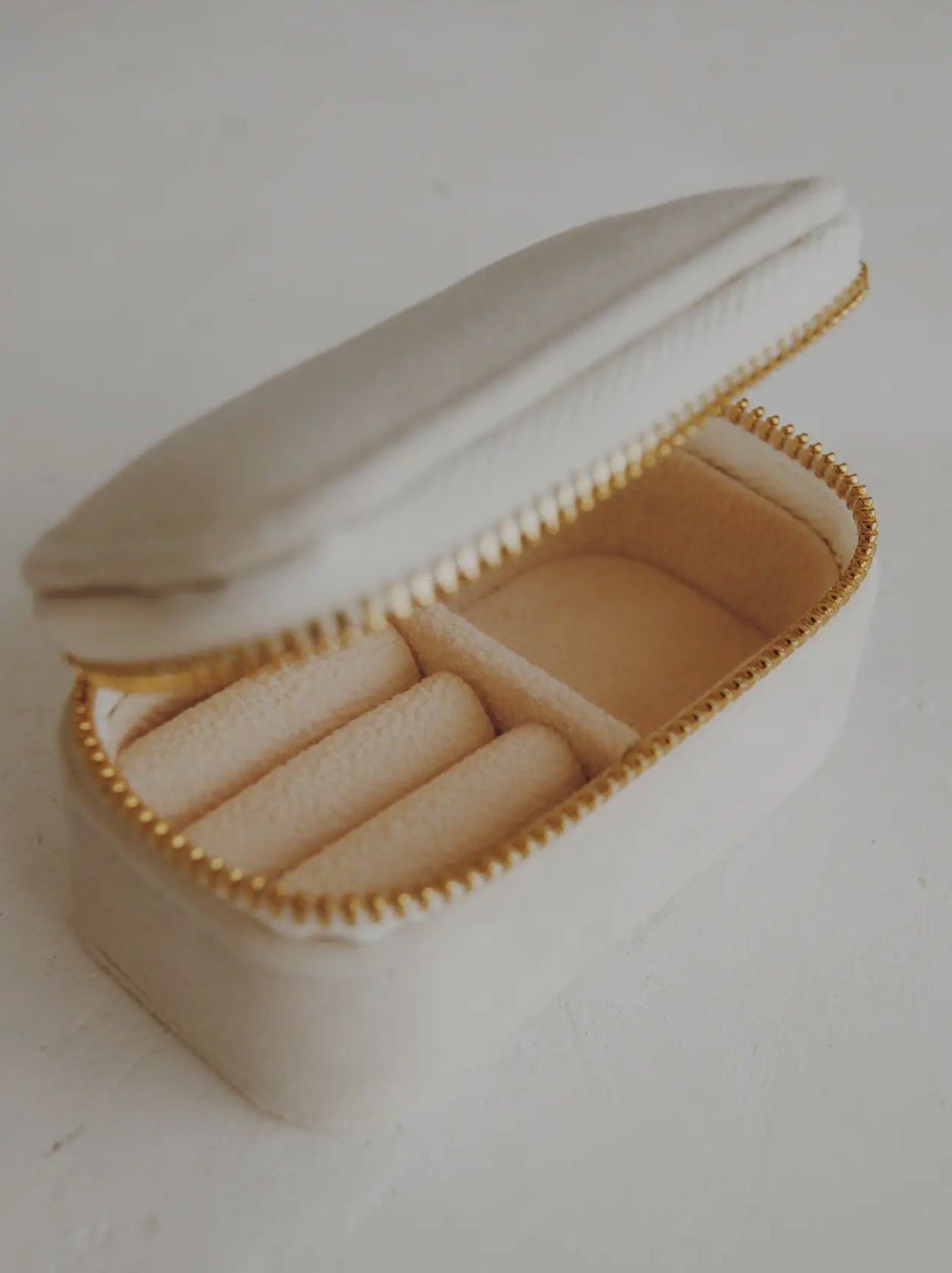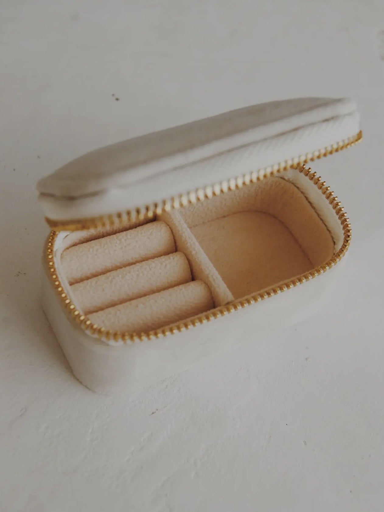 The soft velvet exterior and lining will keep all your jewels precious. Features a ring tray and extra space to hold your other lovely things. Gold plated zipper.